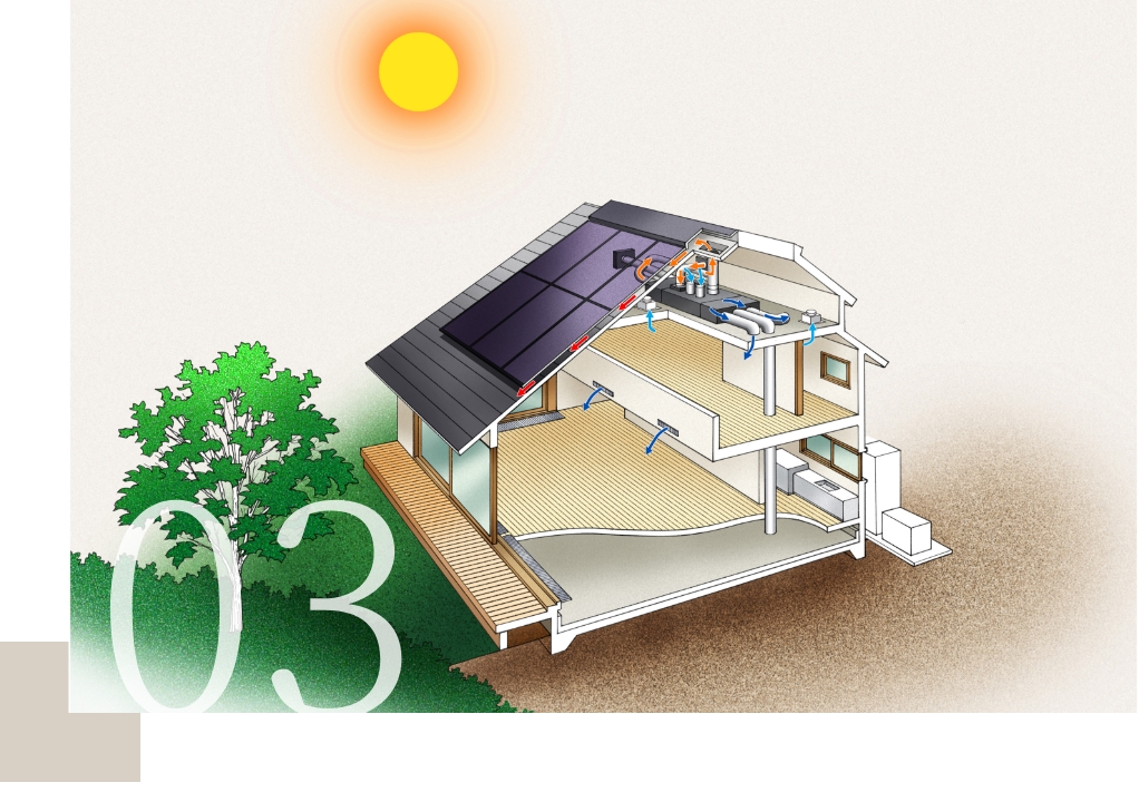 太陽熱を集めて、冬は床暖房、夏は小屋浦の熱を排出し、貯水槽の水を温め、お湯採りができる、パッシブソーラーシステムの住宅です。